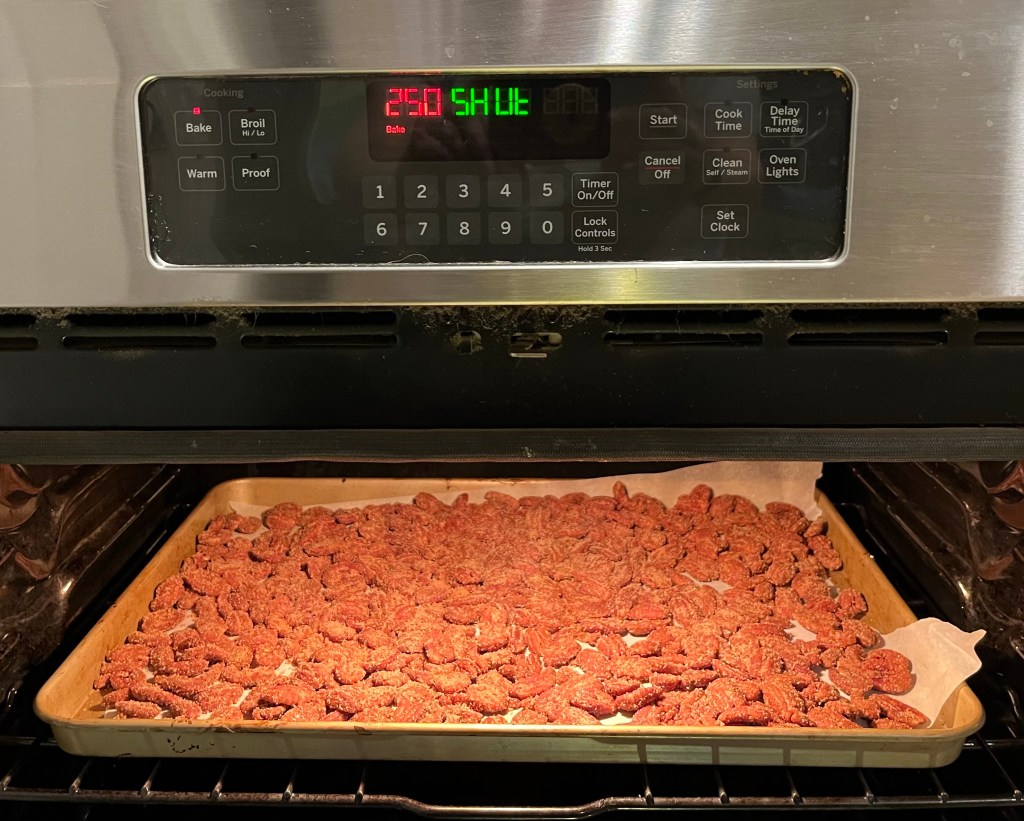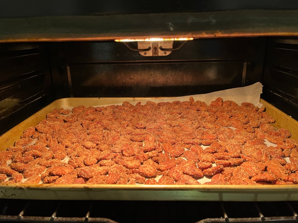 The recipe is fairly simple and easy to make. It is a bit time consuming. Once you have these nuts put together and on your pan, you bake them for a solid hour at 250°. The catch is, you have to stir them every 15 minutes, so if you can’t commit to that, this is not for you.